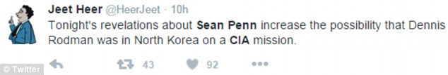 Твит: "Сегодняшние откровения о Шоне Пенне увеличивают возможность того, что Деннис Родман был в Северной Корее с заданием ЦРУ"