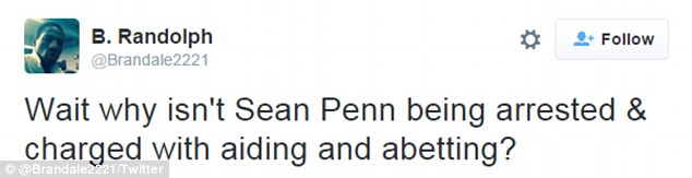 Пользователь Твиттера Б.Рэндольф спросил: "Подождите почему Шона Пенна не арестуют и не обвинят в пособничестве и потворстве?"