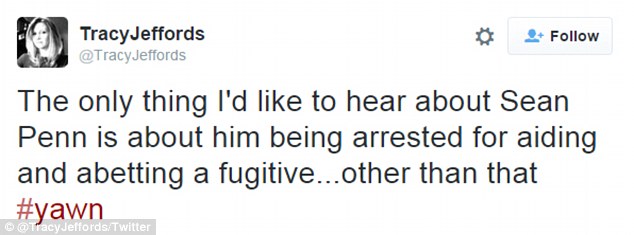Трейси Джеффордс написала в Твиттере: "Единственное, что я хотела бы услышать о Шоне Пенне, это что его арестовали за пособничество и потворство беглецу... в остальном #скука".