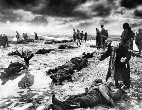 Другой канонический снимок летописи Великой Отечественной, позже вошедший во все советские учебники истории. Евгений Халдей, фотокорр ТАСС, человек-легенда. Снимал Магнитку, Днепрострой, репортажи о Стаханове. Но главная тема съемок в его жизни - Великая Отечественная война. Все 1418 дней войны он прошел с камерой 'Leika' от Мурманска до Берлина. Тысячи военных снимков Халдея стали хрестоматийными, но именно фотография 'Знамя Победы над Рейхстагом' обошла весь мир и стала одним из основных символов победы советского народа в той войне. И пусть то было не первое красное знамя над поверженным Берлином, а солдаты водружающие его - вовсе не Берест, Егоров и Кантария, и даже не столь важна история с отретушированными на чьей-то руке часами - главное, что Халдей уловил значение того момента и сумел выразить его скудными средствами фронтовой фотографии очень профессионально и точно (источники 1, 2).