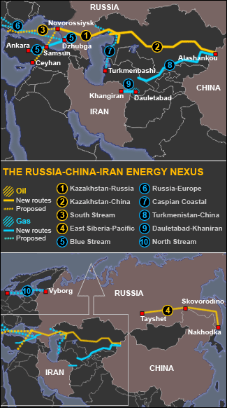 Мы стали свидетелями образования новой схемы сотрудничества по энергоносителям на региональном уровне, которая позволяет обойтись без главных игроков рынка нефтедобычи. По традиции, в авангарде схемы стоит Россия. Китай и Иран следуют за её примером. На территории России, Ирана и Туркменистана располагаются, соответственно, первые, вторые и четвёртые по размеру запасы газа в мире. А Китай в этом веке будет его основным потребителем. Этот вопрос будет иметь глубочайшие последствия для глобальной стратегии США.