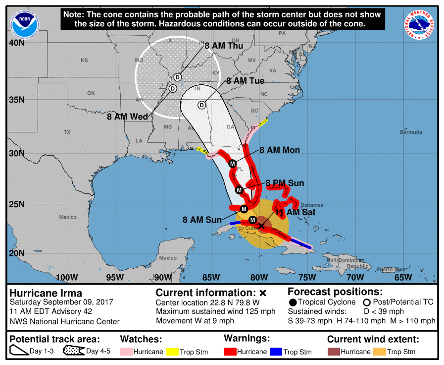Суббота, 11:00 (EDT - восточное дневное время). Ураган Ирма смещался к западу вдоль северного побережья Кубы со скоростью приблизительно 9 миль в час (15 км/ч).