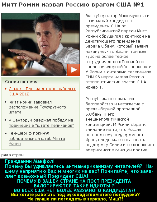 Замечания. 1).Системной программы не имеет ни один из кандидатов, однако у Путина более полная программа. 2).Роль иностранного влияния близка к 0: пиндосы и англосаксонские палачи славянских народов забыли, что Интернет - это обоюдоострое оружие, нельзя лгать всем (всему миру) бесконечно, даже с помощью провокаторов. Синагога терпит крах: не в деньгах правда. 3).В данный момент времени Путину альтернативы нет.