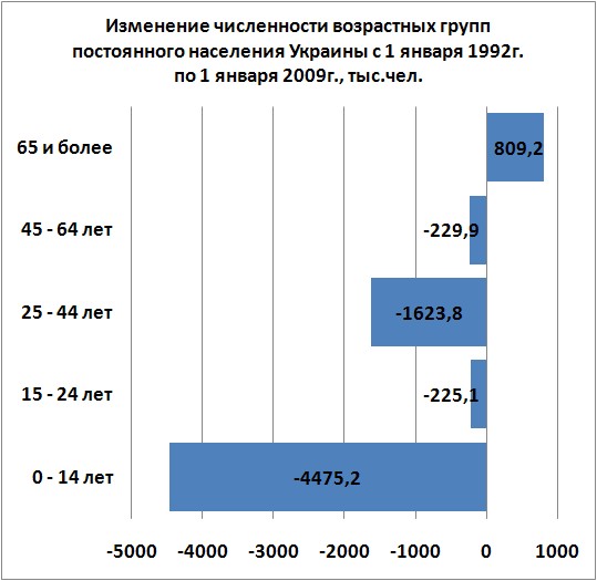 Статистические данные взяты из официальных данных Государственного комитета статистики Украины ( www.ukrstat.gov.ua ). Итак. 1. Распределение постоянного населения Украины по возрастным группам, млн.чел. (IMG:http://Audit.narod.ru/IMAGE/Diagram058.jpg) 2. Изменение численности возрастных групп постоянного населения Украины с 1 января 1992г. по 1 января 2009г. (IMG:http://Audit.narod.ru/IMAGE/Diagram059.jpg) |