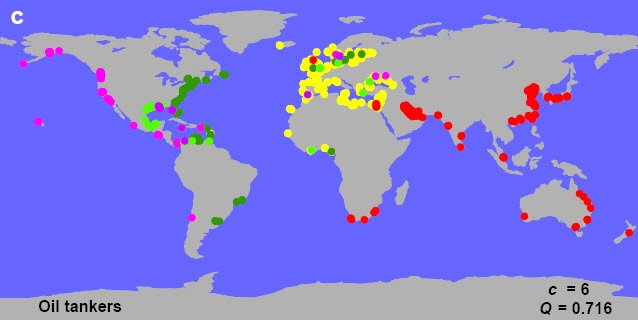 Как известно, 90% всего мирового грузооборота приходится на морской транспорт. Не смотря на это, вплоть до недавнего времени попыток провести комплексный анализ сети морских транспортных перевозок было не много, в отличие от исследований связанных с анализом транспортных задач автомобильного, ж/д- и авиа-транспорта. Недавно несколько ученых из Университета Ольдинбурга (Германия) провели такой анализ, используя данные о более чем 16 000 маршрутах между 951 портами, и выявили следующие факты (кратко): * Морская транспортная сеть представляет собой структуру типа "small world network" (это такой тип математических графов, в которых большинство узлов не являются соседними, но большинство вершин графа могут быть достигнуты за небольшое количество шагов. Пример: теория 6 степеней удаленности или 6 рукопожатий, http://en.wikipedia.org/wiki/Small-world_network, ); * Средняя длина пути между двумя случайными портами составляет 2,5 перехода, в отличие от авиасообщения, где аналогичный параметр составляет 4,4 перелета. * Морская сеть является ассиметричной: более половины всех портов связаны между собой только в одном направлении, то есть доставка груза редко происходит по принципу "туда и обратно"; * Пожалуй, наиболее интересным является то, что транспортная сеть различных классов судов образует разные паттерны. Исследователи проанализировали схемы движения трех типов судов: контейнеровозов, сухогрузов и нефтяных танкеров. И если контейнеровозы, как правило, имеют регулярный характер движения, то движение части сухогрузов и нефтяных танкеров носит гораздо менее регулярный характер. Это может объяняться тем, что большое количество сухогрузов и нефтяных танкеров чаще всего ходит пустыми. Это исследование дает возможность по-новому взглянуть на структуру мировой торговли, а также может помочь морским биологам в анализе влияния человека на распространение видов организмов, переносящихся морскими судами. От себя могу добавить, что авторы хорошо знают методы анализа социальных сетей, но тема СевМорПути не раскрыта. Ссылка: http://arxiv.org/abs/1001.2172 Ниже несколько картинок: Рис. Сеть морских грузовых перевозок (в легенде - степень централизации, степень кластеризации, связности и прочие) ![]()