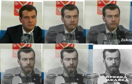 в качестве картинок-иллюстраций Шиза, ну во что вы превратили Медведева, неужели в Николая Второго? |