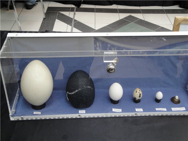Точно знаю, что белое яйцо посередине – куриное, черное большое – страусиное, чьи остальные - понятия не имею.